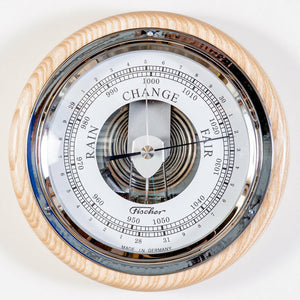 This beautiful Ash and chrome barometer & Tide Clock has a modern feel. It has been lovingly engineered to perfection in Germany by Fischer. The face clearly indicates which direction the weather is going to go on any given day, from rain to shine, depending on the barometric pressure in the air.